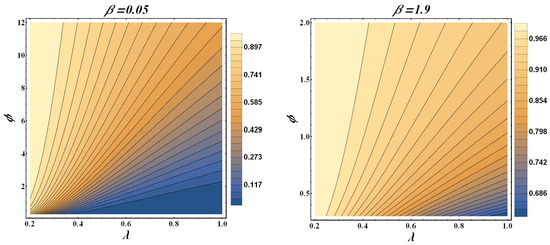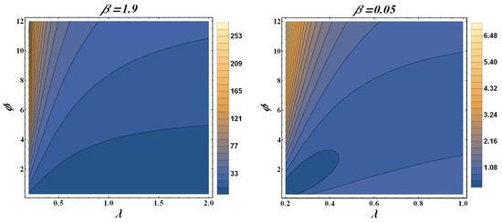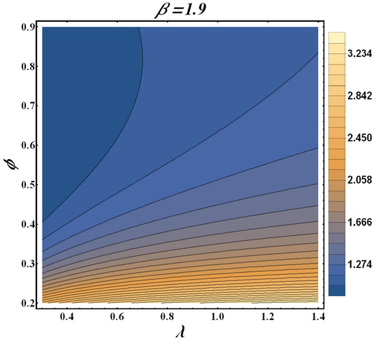 A contour map typically shows a bunch of lines, often wavy or forming concentric, irregular closed loops or other patterns. Each of these lines, called a contour or contour line, is simply a line along which some quantity (for example, wind speed temperature) is everywhere the same. Contour graphs are plotted for skewness and median behavior in comparison to HLUG-TI distribution and the pertinent parameter values in Figure 5, Figure 6 and Figure 7 for various values of . It is observed that skewness increases at higher values of but lower levels of for both (see Figure 5). Furthermore, in Figure 5, it is noted that lower skewness occurs near all levels of and lower levels of . Figure 6 demonstrates that for lower levels of and all levels of kurtosis is increased, whereas for all levels of and higher values of it declines. Furthermore, when and kurtosis is decreased. Moreover, in Figure 6 for all levels of , and , the kurtosis declines, whereas for lower levels of and the kurtosis increases. Figure 7 shows plotted contour graphs for the median of the HLUG-TI distribution for various values of pertinent parameters. It is noted that for higher levels of parameters and , the median is increased, whereas it declines for lower values of parameters and higher levels of . On the other side, a similar trend is noted for (see Figure 7).