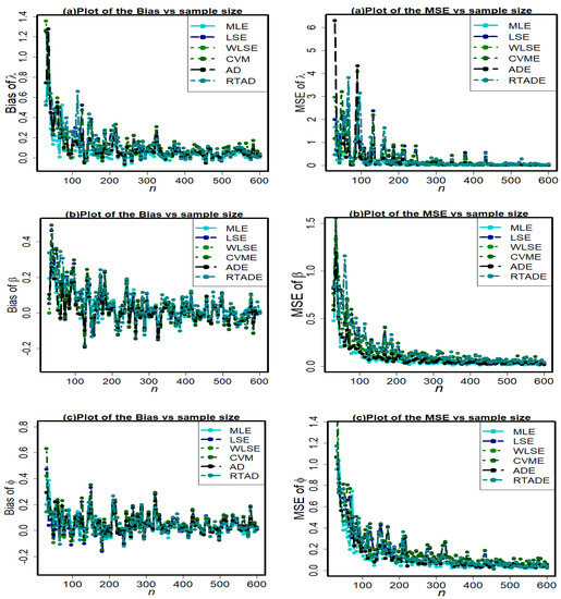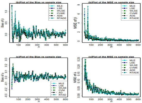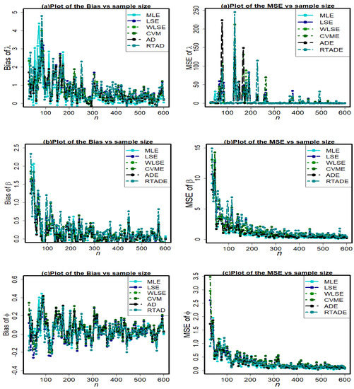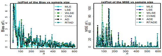 4. For all estimation approaches, these procedures were repeated for with the aforementioned parameters. To determine the value of estimators, we used R’s optim function. In Figure 9, Figure 10 and Figure 11, the simulation outcomes are shown graphically. As seen in Figure 9, Figure 10 and Figure 11, these biases and MSEs change with regard to n (left and right panels).