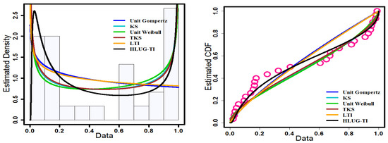 In this section, we implement the HLUG-TI model on practical datasets to demonstrate its versatility in comparison to a set of competing models. The objective of the HLUG-TI model is to provide an alternate distribution to fit the unit interval data in comparison to other distributions found in the literature. The first dataset from the reliability engineering field consists of 20 observations of the failure times of mechanical components [24]. The second dataset relates to the total milk yield in the first birth of 107 cows at the Carnauba farm in Brazil. These data are available in these studies [25,26]. To conclude, for the two datasets, the HLUG-TI model shows to be the most suitable model, demonstrating its applicability in a realistic environment. The parameters of the models were estimated by the MLE method [27,28].