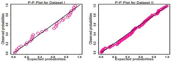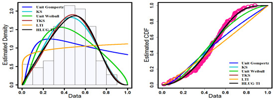Now, we compare the HLUG-TI model to a set of competing models, which are as follows: unit-Gompertz [1], Kumaraswamy [29], unit-Weibull [30], transmuted Kumaraswamy (TKSW, [31]) and Lehmann Type-I (LTI, [32]) distributions. To determine the rationality of utilizing the HLUG-TI distribution to fit these datasets, the goodness-of-fit measures the following: Akaike information criterion (AIC), Bayesian information criterion (BIC), Cramer–von Mises (CVM) and Anderson–Darling (AD). Consequently, the Kolmogorov–Smirnov (K-S) test is considered, and the P-value (PV) of K-S test was specified to compare models. The K-S statistic of the distance between the fitted and empirical distribution functions is one of the most widely used goodness-of-fit test statistics for determining how well a random sample’s distribution agrees with a theoretical distribution. The best model has high PV and low AIC, BIC, CVM, and AD values [33]. An overview of the estimated MLEs and fitted information criteria for both data sets using various models can be seen in Table 2, Table 3, Table 4 and Table 5. The values of the above measures suggest that the HLUG-TI model is a suitable competitor to other competitive distributions, and it also has the best fit among them. The histograms of the data sets and the fitted density function, as well as the plot of the empirical and estimated CDF of these fitted distributions, are shown in Figure 12 and Figure 13 to help determine if the HLUG-TI model is suitable. Figure 14 also shows the P-P plots for the HLUG-TI model. Based on such graphical methods, we can suggest that the HLUG-TI model is a better model for the data sets under consideration. The profile likelihood functions of parameters of HLUG-TI for both data sets are presented in Figure 15 and Figure 16.