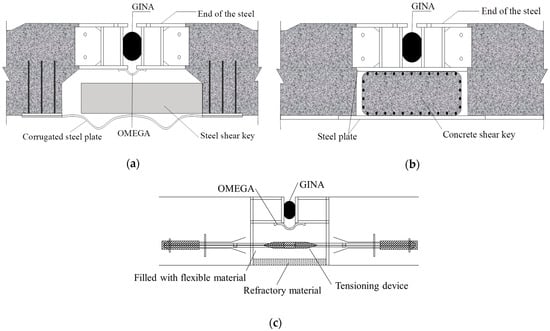 A wide variety of immersed tunnel joints are available to provide different adaptability to differential settlement. These joints are generally classified according to the ratio between the stiffness of the joint itself and the stiffness of the element section: cast-in-place concrete joints are considered rigid, joints that do not contain shear resistance are considered flexible, and those with a stiffness ratio between the above two are considered semi-rigid and semi-flexible to semi-rigid [15,16]. Therefore, the types of immersed tunnel joints can be divided into four categories in detail: rigid joints, flexible joints, semi-rigid joints, and semi-flexible to semi-rigid joints. As the rigid joints formed by cast-in-place concrete are not considered in this study, their cross-section is not given below. The cross-sections of the other three joints are shown in Figure 1.
