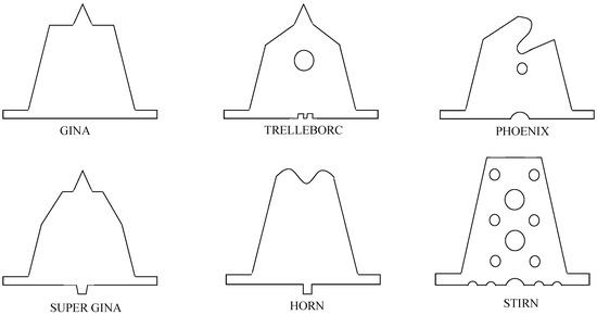 The traditional GINA gasket has developed a variety of cross-sectional shapes based on years of practice. The representative ones are the TRELLEBORC type, developed in the Netherlands; the PHOENIX type, developed in Germany; the HORN type, developed in Japan; the STIRN type; and the GINA improved type. Several types of cross-sectional shapes of GINA gaskets are shown in Figure 4.
