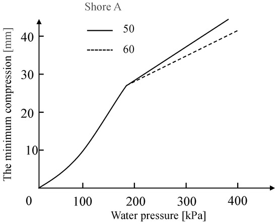 The two types with the hardness of 43 and 48 Shore A show a small change in stiffness at the same deformation, and the type with the hardness of 58 Shore A shows a large change in stiffness, according to Figure 2. The unit Shore A is a physical measure of a substance’s ability to deform under pressure or resist puncture. Shore A is generally used to characterize softer rubber materials with a hardness range of 10 to 90. The higher the value of Shore A is, the higher the hardness [20]. The influence of rubber hardness on the stiffness is not obvious when the compression deformation is less than 90 mm, and the stiffness changes significantly with increasing hardness when the compression deformation is more than 120 mm. The material characteristics of the GINA gasket with an abrupt inflection point provide an important reference for determining the threshold of waterproof failure.