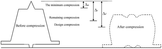 The design compression is usually not equal to the remaining compression of the GINA gasket because the remaining compression of the GINA gasket will vary due to external loads or deformations, e.g., uneven settlement. The relationship between each compression characteristic is shown in Figure 7. In the design and installation phase, the design compression is determined according to Equation (2),