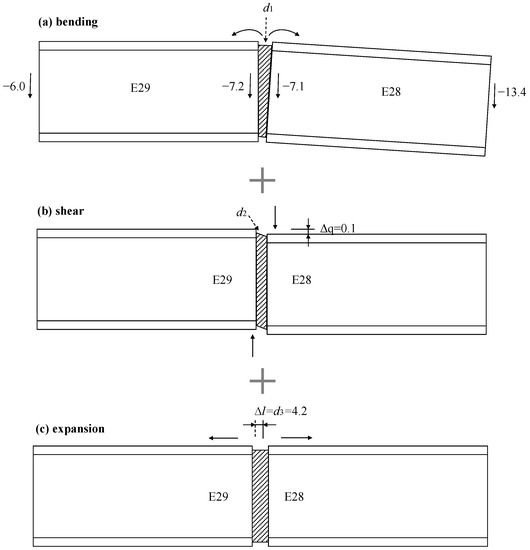 Based on the uneven settlement data of E28 and E29 of the HZMB Immersed Tunnel during the first half of 2020, the total change in compression of the GINA gasket can be calculated by Equation (12). The mechanical decomposition of the deformation modes of immersed tunnel joint is presented in Figure 15.