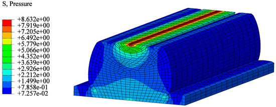 The design compression of the GINA gasket is 140 mm. Based on the average water depths of E28 and E29 and the height of the pipe section, the water pressure = 0.385 MPa. The design compression of 140 mm of GINA gasket is simulated in ABAQUS, and the results are shown in Figure 18. The stresses (pressure) at the top and bottom of the GINA gasket both exceed 1.5 MPa, which is much higher than the water pressure = 1.155 MPa. Therefore, the waterproofing capacity of the GINA gasket fully meets the requirements under the situation of design compression.