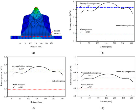Bottom pressure of GINA gasket under different remaining compressions: (a) range of bottom pressure; (b) remaining compression = 108 mm; (c) remaining compression = 97.2 mm; (d) remaining compression = 86.4 mm.