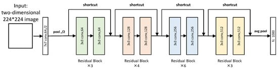 ResNet34 [29] is one of the classical ResNet networks. The input image size of this model is 224 × 224 pixels, and it includes one convolutional network and four residual convolution blocks. Each internal residual convolution block includes a different number of convolution blocks. Finally, a fully connected layer is used at the end of the network. The whole architecture of ResNet34 is shown in Figure 2.