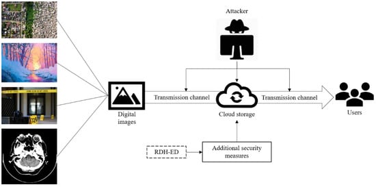 Due to the constant development of information technologies, the use and distribution of digital multimedia has become part of the everyday life of today’s society, which has allowed digital images to be widely used in entertainment, education, and even business applications [1,2,3]. However, all kind of images stored in the cloud can be easily copied, modified or falsified in an unauthorized way, during the different stages of transmission and storage; in some cases, the information associated with their files can be manipulated, as illustrated in Figure 1. To provide an additional security mechanism capable of dealing with this problem and thereby protect the visual content, intellectual property, and associated information, as well as authenticate the images in question, various reversible data hiding (RDH) [4] approaches have been presented in the literature as a promising solution, such as reversible data hiding in the encrypted domain (RDH-ED) methods.