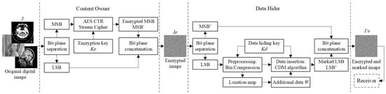 For this purpose, the process phases of the proposed scheme are divided according to the entities involved: (a) the content owner encrypts the image and reserves the LSB planes where the data will be stored, (b) the data hider embeds the additional bits into the encrypted image in the designated space, and (c) in the last stage, the receiver is able to recover the hidden data and restore the image completely. Additionally, the data hider will preprocess the image to increase the capacity and avoid pixel saturation problems caused by embedding bits via CDM. The whole procedure described above is shown in Figure 2 and explained in detail below.