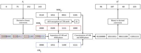 - Each binary representation is partitioned so that the most significant bit planes (MSBs), designated as , are separated from the least significant bits . In the case of natural images, the first 2 MSB planes will be used, while the rest of the planes will be considered as LSB.