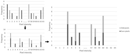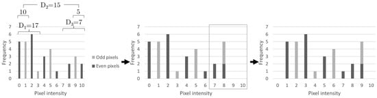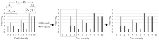 - Finally, in case the lowest pixel concentration is on the far right, the odd pixels in the interval D3 = [limSup − 2N + 1, limSup] decrease their value by 1 and are combined with the even intensities. As in the previous cases, the modified and unmodified pixels are recorded as 1 and 0 in the location map, respectively.