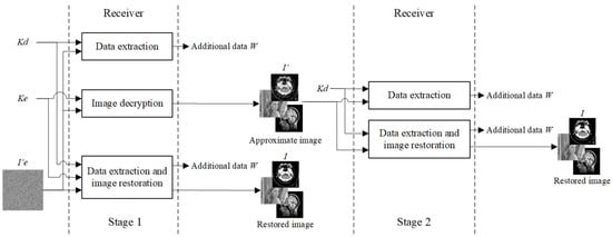 In the final stage, a legitimate receiver with the image will have access to the different elements, depending on whether it possesses the encryption key Ke or the data hiding key Kd. Thanks to the complete separability, it is possible to extract the data and recover the image from the encrypted domain Ie or from the plaintext of the approximate image I′. The cases available at the reception are presented in Figure 7; the first stage corresponds to the normal separability property and is carried out from the encrypted and marked version . On the other hand, the second stage is only possible in complete separable RDH-ED schemes and allows to recover the data or the image from the approximation I′ later when the receiver considers it necessary. The specific operations for each case are explained below.