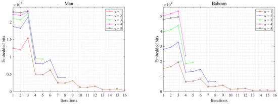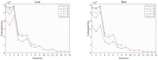 - In such a way that the bits will be embedded into LSB planes, when evaluating the vectors according to Equation (4):where is the gain factor and the evaluation parameter . Embedding intensity is controlled by the value of α; as its value increases, the number of vectors suitable for embedding will also increase and the degradation will be more perceptible in the directly decoded image.