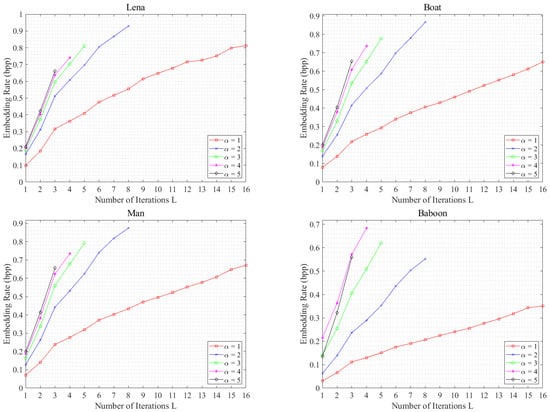 When analyzing the data obtained, it can be observed that the PSNR values of the four images are very similar for the same values of α and L. For example, with α = 1 and L = 8, the images Lena, Boat, Man, and Baboon present PSNR values of 34.875, 30.585, 30.790, and 31.668 dB, respectively. This effect is because all image pixels are modified according to Equation (4), regardless of whether or not they are suitable for carrying additional bits, so that the pixel intensities will present similar variations depending on the parameters used and not on their values.