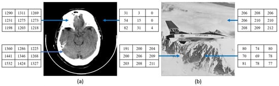 Due to sensitive data and visual content of medical images, RDH-ED schemes are presented as a promising solution to counteract some of the security issues present in the context of transmission and storage of medical imaging. However, very few proposals for RDH-ED schemes focused on medical images have been presented in the literature [25,26], because most data hiding methods rely on spatial redundancy and the pixel nature of the different imaging modalities does not allow their correct implementation. To better illustrate this phenomenon, some sample neighborhoods of the pixels that make up a computed tomography (CT) scan and a natural image are presented in Figure 11. For the CT scan of Figure 11a, three regions of the image were selected showing a light, dark, and a white section near gray intensities; with this, it is observed how light pixels that visually look like a white color are represented by values in a range of [1198, 1311], black color intensities present values in the range [0, 82], while a region of multiple textures shows values in an interval [1225, 1532]. In contrast, the pixels in Figure 11b show pixels with values in the range of [206, 212] for light intensities, while the two regions with multiple textures consist of pixels with values of [191, 211] and [69, 81].