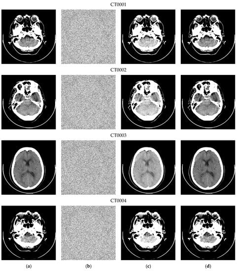 To demonstrate the correct operation of the developed scheme, the scheme was applied to 50 CT scans in grayscale, with dimensions of 512 × 512 pixels and a resolution of 12 bits/pixel, made up of pixels . The set of medical images, used in the experimentation, is mainly composed of skull images and was provided by the Mexican Institute of Social Security (IMSS). Some of these images and the results of the implementation are shown in Figure 12 and were visualized using the dedicated software of [31].