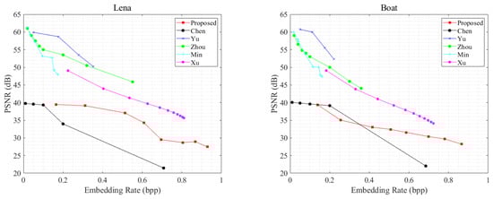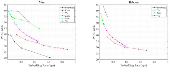To demonstrate the contributions of the present work, the performance comparison between the proposed scheme and the most recent complete separable RDH-ED methods reported in the literature [9,10,11,12,13] will be performed next; however, ref. [14] will not be included in the comparison, because it is an RDH scheme for multiple encrypted images and its work methodology is different from that of the schemes. For comparative purposes, results from the Lena, Boat, and Man images will be used, since they are the most reported classical images in the literature, as well as data obtained from the Baboon image, since this image allows observing the performance of the schemes on images with complex texture regions. Figure 13 shows the performance comparison in terms of PSNR and the corresponding bit embedding rate obtained from the directly decrypted versions. The images restored by these schemes and the proposed one are not compared, since they are fully recovered and do not show any visual distortion.