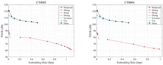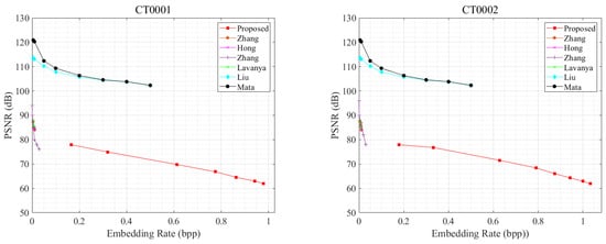 With the graphs of Figure 14, it is easily observed that, as with natural images, the capacity of the proposed scheme is far superior to that reported by the other methods. Adaptations of functional RDH-ED schemes on natural images [21,22,23,24] do not operate properly on medical images, resulting in poor performance, reflected in the low embedding capacity that is hardly close to 0.05 bpp, with PSNR values below 95 dB. While the schemes [25,26] show very similar performance, they only outperform the proposed scheme in imperceptibility for ER equal to or less than 0.5 bpp with PSNR values above 100 dB.