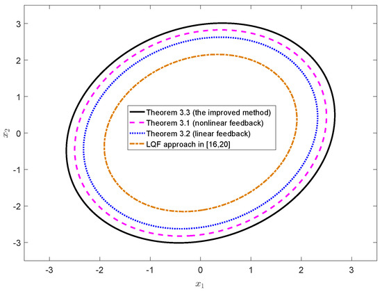 Figure 2. The invariant sets of the CLQF (derived by Theorems 1–3) and the LQF (derived by the method in [25,26]).