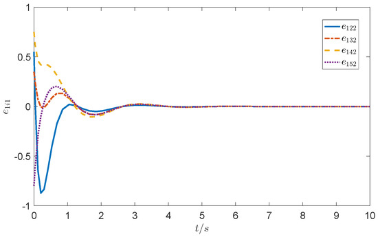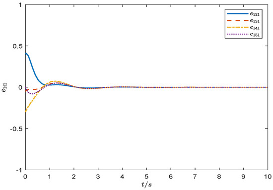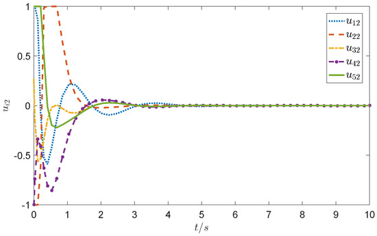 The state response errors between agent 1 and agent i are defined by [ e 1 i 1 , e 1 i 2 ] T , and these simulation results are presented in Figure 3 and Figure 4. Meanwhile, the responses of saturated input u i 1 and u i 2 are depicted in Figure 5 and Figure 6. It is obvious that the state errors of agents and the saturated inputs gradually converge to zero.