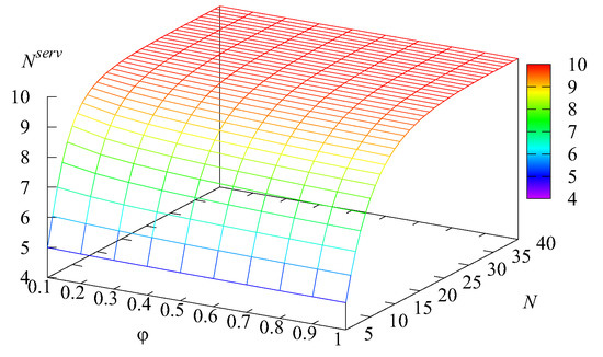 The surface showing the dependence of the cost function on the number of servers N and the impatience rate is presented in Figure 10.
