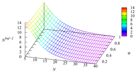 It is natural that the value of the mean number of requests in the first buffer increases when the capacity K of this buffer increases. The essential growth of when the capacity R of the second buffer decreases is explained as follows. When R decreases, more Type-2 requests are pushed out from the second buffer due to the arrival of new Type-2 requests. Therefore, the probability that the main buffer is empty decreases and the chances of Type-1 requests to realise their priority via the privilege to be taken for service when the main buffer becomes empty decrease. This leads to the increase of The maximum of the mean number of requests in the second buffer is essentially larger than the maximum of This occurs due to the higher arrival rate of Type-2 requests and the lower rate of transition from the intermediate buffer to the main one. However, the influence of the relation of the capacities of the intermediate buffers is also high. If R is small, clearly, this reduces the part of the priority of Type-1 requests achieved via their higher rate of transition from the intermediate buffer to the main buffer.