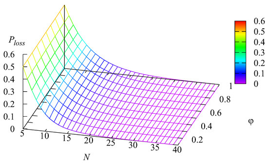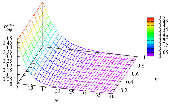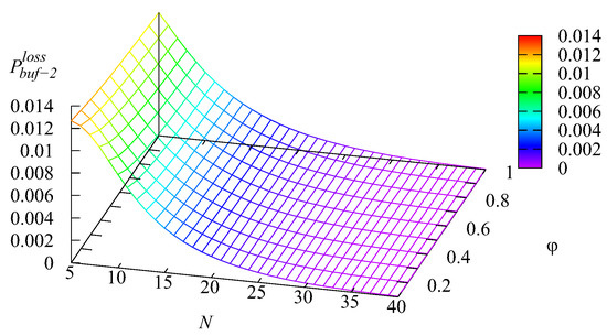Because an arbitrary request loss in the intermediate buffer is due to impatience, it is clear that the loss probability increases with the increase of the capacity of the kth intermediate buffer, Because the capacities of these buffers are relatively small and the impatience rate in the infinite main buffer is larger compared to the rates in the intermediate buffers, the probability of an arbitrary request from the main buffer also is larger. As is seen from Figure 16, Figure 17, Figure 18 and Figure 19, this probability is a dominating summand at the right-hand side of the relation The decrease of the probability when the capacity R grows is explained by the the increase of the probability , leading to the decrease of the arrival rate at the main buffer, the decrease of the queue length in this buffer, and eventually, the decrease of the rate of requests’ departure from the main buffer due to impatience.