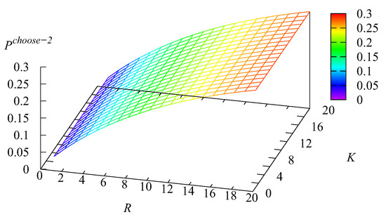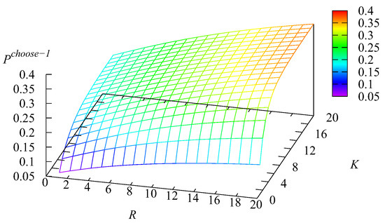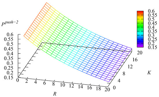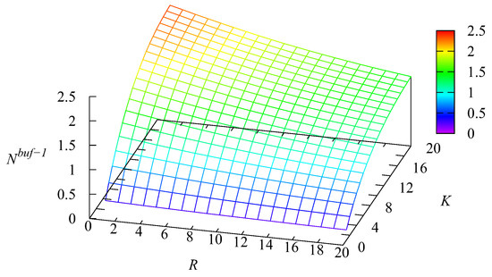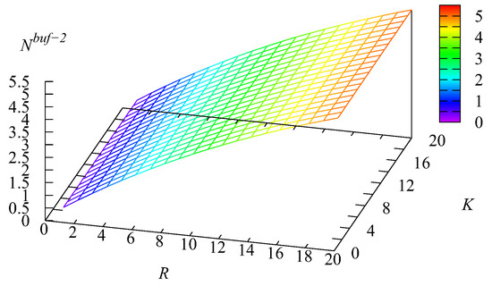 Figure 14 and Figure 15 depict the dependence of the probability that an arbitrary Type-k request will be selected for service from the k buffer, without visiting the main buffer on K and Recall that, for Type-1 requests, this can happen if all N servers are busy, the main buffer is empty, the service in one of the servers is completed, and the first intermediate buffer is not empty. For Type-2 requests, this can happen if all N servers are busy, the main buffer is empty, the service in one of the servers is completed, the first intermediate buffer is empty, and the second intermediate buffer is not empty. Figure 14 correlates with Figure 13. When K and R are large, the mean number is the minimal. Thus, the probability that the infinite buffer is empty at the moment of a server releasing is high and the probability is large. Analogously, when K and R are small (the main role is played by the capacity R of the intermediate buffer, which stores a more intensive flow of Type-2 requests), the mean number is the max. Thus, the probability that the infinite buffer is empty at the moment of a server releasing is small, and correspondingly, the probability is small. The growth of with the increase of K (which is sharper when K is still relatively small) stems from the increase of the probability that the first buffer will not be empty at the moment of a server releasing. The reason for the growth of with the increase of R is similar. The impact of the variation of K on the value of is weak.