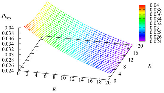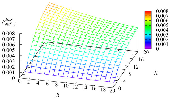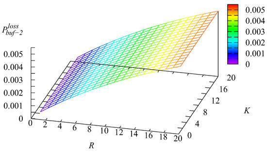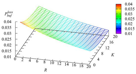 Figure 16, Figure 17, Figure 18 and Figure 19 show the dependence on K and R of the following loss probabilities: the probabilities of an arbitrary request loss from the kth buffer, the probability of an arbitrary request loss from the main buffer, and the probability of an arbitrary request loss.