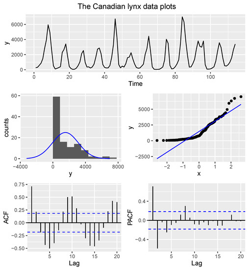 Firstly, we used the Canadian lynx dataset, which has been extensively used in various statistical applications and previously found to be non-Gaussian [1,4,8]. The dataset has been shown to model well with an autoregressive time series process (see [45,46,47], among others). The Canadian lynx dataset consists of 114 observations of the annual record of the number of lynxes trapped in the Mackenzie River district of North-West Canada for the period from 1821 to 1934 (see [45] for more details). The Canadian lynx data are
