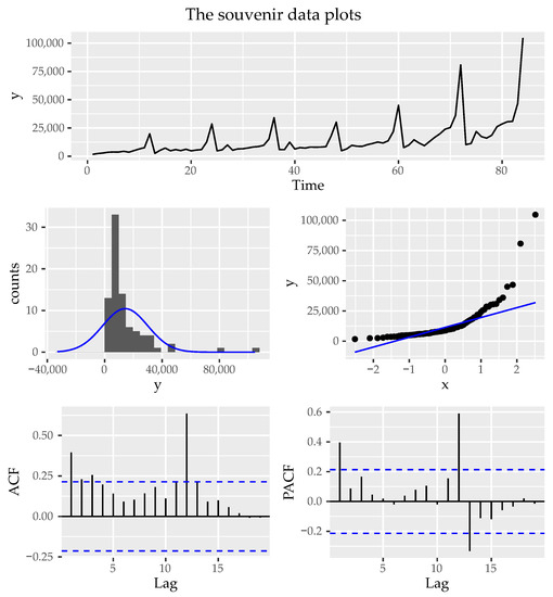 This real data study intends to demonstrate the practical applicability of our proposed test under a normally distributed time series process using 84 monthly sales for a souvenir shop at a beach resort town in Queensland, Australia (see [48] for more details). These sales were recorded from January 1987 to December 1993 and have been used for various time series applications (for example, see [49,50], among others). However, the time series data are not consistent with the normal distribution and are not stationary [49]. To verify these claims, we conducted tests for the Gaussianity and stationarity of a time series process using the k random projections test and the augmented Dickey–Fuller test, respectively. We supplemented these tests with diagnostic plots for assessing the stationarity and normality in time series processes (see Figure 2).