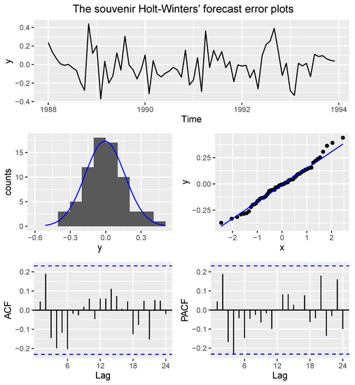 The results revealed that the monthly sales for the souvenir shop do not follow a Gaussian process (k = 16, p-value < ) and are not stationary (Dickey–Fuller = −2.0809, p-value = 0.5427), which is a similar finding reported by the graphical plots presented in Figure 2. Since the goal is to examine the performance of our proposed test under a normally distributed time series process, we used the Holt–Winters exponential smoothing to obtain the forecast errors for the monthly sales of the souvenir shop, which are well-known to be stationary and consistent with normality [49]. The Holt–Winters exponential smoothing was ideal because the time series process of the log of monthly sales for the souvenir shop can be described using an additive model with a trend and seasonality. Thus, to obtain the forecasts, we fitted a predictive model for the log of the monthly sales. We then obtained the forecast errors and used the same testing procedures reported earlier to assess whether these errors are indeed normally distributed and stationary.
