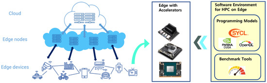 Recently, the high-performance computing (HPC) community has overcome the limit of exa-scale ( floating point double precision operations per second) [1] computing and is now aiming to reach the next level of zeta-scale ( operations per second) computing. To accomplish this goal, innovative technology developments across the entire stack of HPC hardware and software environments are imperative in order to squeeze out as much performance as possible at every level of the stack. In particular, one of the main focuses is on cloud computing—an infrastructure that can flexibly scale up large-scale processing units and storage systems [2,3]. Accordingly, research on edge computing that can address the data bottleneck issue in the cloud environment is also active [4,5,6,7].