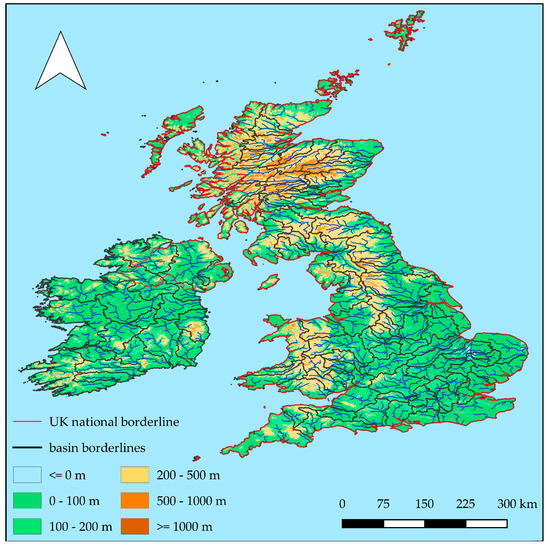 The territory of the UK has a dense drainage network, with about 200,000 km of watercourses draining around 1500 discrete basins (Figure 1) [,]. The numerous watercourses are short, shallow, and prone to significant disturbances caused by anthropogenic influence. The river regime is influenced by climatic conditions (above all precipitation, air temperature, and insolation), geological features of individual catchments (their permeability), terrain morphology, and anthropogenic factor (riverbed changes, water utilization, land-use changes, etc.).