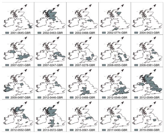 The flood data used in this study were taken from the Emergency Events Database Center for Research on the Epidemiology of Disasters (EM-DAT database). This database was launched by the Center for Research on the Epidemiology of Disasters (CRED) in 1988 with the initial support of the World Health Organization (WHO) and the Belgian Government []. EM-DAT database contains essential core data on the disasters in the world from 1900 to the present day and it is compiled from various sources. Data collection in the EM-DAT database was carried out according to the place of origin, development, and cause of disasters, and the classification was made according to the one proposed by the United Nations. For a disaster to be entered into the EM-DAT database, at least one of the following criteria must be fulfilled: ten or more reported deaths; one hundred or more reported people affected; declaration of a state of emergency; and call for international assistance []. In this study, twenty floods in the UK recorded in the EM-DAT database were selected for the period 2001–2019. One flood was registered in 2001, three in 2002, one in 2004, three in 2007, two in 2008, one in 2009, five in 2012, and one in 2014, 2015, 2017, and 2019. Out of twenty selected floods in the EM-DAT database, fourteen were classified as riverine floods, three were flash floods, and the remaining three were not defined in more detail. The geographical locations of the studied flood events are presented in Figure 2. Regarding the regional aspect, out of twenty analyzed floods, eighteen occurred in England, five in Wales, four in Scotland, and two in Northern Ireland. According to the seasons, most of the floods occurred in autumn (eight), followed by summer (seven), winter (three), and spring (two). The duration of the floods ranged from one day (in July 2002, December 2012, and December 2015), to twenty-eight days (November–December 2012). The average duration of the selected floods was 4.6 days. Areas endangered by floods ranged from 60 km2 to 126,150 km2 and occurred in numerous rivers basins, such as Thames, Severn, Stour, Exe, Ouse, Dearne, Aire, Avon, Calder, Don in Yorkshire, etc.