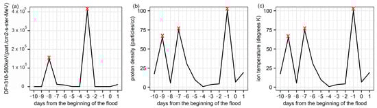 - Differential electron and proton flux (DF, p/cs2-sec-ster). These blocks contained different sun energy characteristics for different periods during different flood events. The measured ranges for differential electron flux were 38–53 keV and 175–315 keV for all analyzed floods, while the measured ranges for differential proton flux varied depending on the period in which the flood occurred. The differential proton fluxes were measured in the following ranges: 47–65 keV, 47–68 keV, 65–112 keV, 112–187 keV, 115–195 keV, 310–580 keV, 761–1220 keV, 795–1193 keV, 1060–1900 keV, and 1060–1910 keV. However, the only common range for all flood events was 310–580 keV.