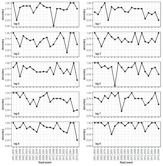 According to our hypothesis, the period of delay between the flood and the outbreak of solar activity can be up to 10 days. To test this hypothesis, the following experiment was performed. All classification models were fitted and tested for input data that did not contain a time delay. Next, the data containing a time delay of one day were added to the input parameters. After that, the models were refitted, and the recall metric was calculated. These iterations lasted up to 9 lags due to the fact that we only had data available for 10 days before the flood. Shifting the data by 10 days and deleting the 10 empty records that should appear would result in no flood days remaining in the target field. Accordingly, this would make classification impossible. Formally, the tasks of classification were reduced to the following form: