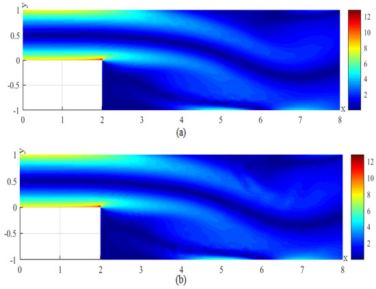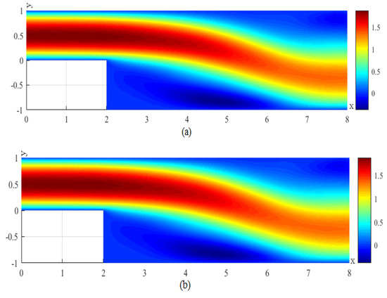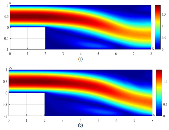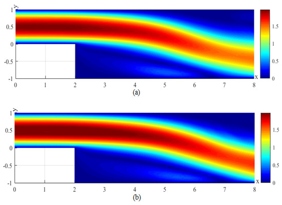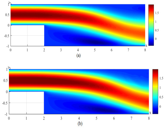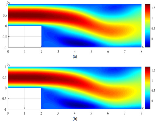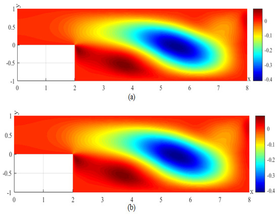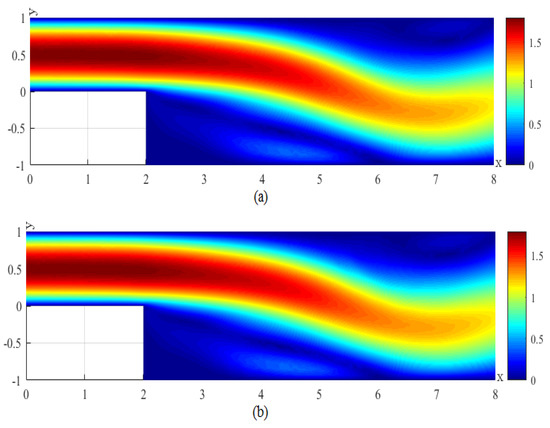 In order to compare the RDRCNMFE solutions with the CNMFE solutions, by solving Problem 5 and Formula (37), we also compute the CNMFE solutions of the components of the velocity, the velocity magnitude (), and the pressure at , 6, 8, and 10, pictured in photo (a) of Figure 2, Figure 3, Figure 4, Figure 5, Figure 6, Figure 7, Figure 8, Figure 9, Figure 10, Figure 11, Figure 12, Figure 13, Figure 14, Figure 15, Figure 16 and Figure 17 (where the negative value of v is attributed in the negative y-axis direction). Each pair in Figure 2, Figure 3, Figure 4, Figure 5, Figure 6, Figure 7, Figure 8, Figure 9, Figure 10, Figure 11, Figure 12, Figure 13, Figure 14, Figure 15, Figure 16 and Figure 17 is highly similar, which means that the numerical results of the RDRCNMFE method are sufficiently close to those of the CNMFE method.