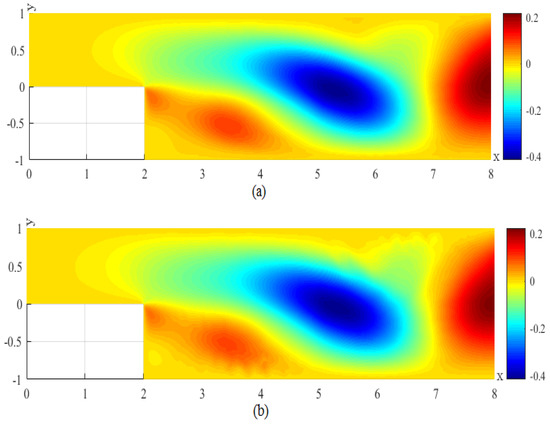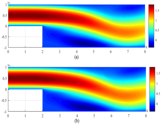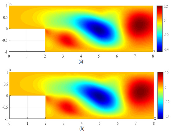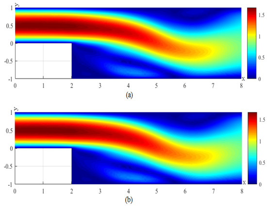 We first obtain the initial 20 CNMFE vorticity coefficient vectors ( 20) by solving the CNMFE method at the initial 20 time steps and make up the snapshot matrix . Then, according to the way in Section 3.1, we calculate out the eigenvectors corresponding to the eigenvalues (arranged degressively) in the matrix that satisfy . Thereupon, we merely need to take the first six eigenvectors to generate a set of POD bases with . Finally, we seek the RDRCNMFE solutions of the components of velocity, the velocity magnitude (), and the pressure at , 6, 8, and 10 by using Problem 6 and the formula (37), pictured in photo (b) of Figure 2, Figure 3, Figure 4, Figure 5, Figure 6, Figure 7, Figure 8, Figure 9, Figure 10, Figure 11, Figure 12, Figure 13, Figure 14, Figure 15, Figure 16 and Figure 17.