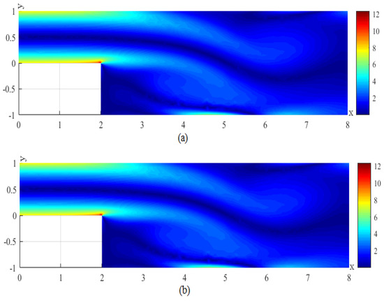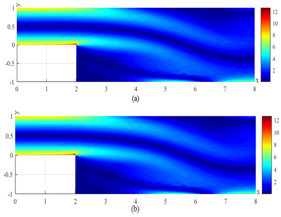 (a) The velocity magnitude for the CNMFE solution at . (b) The velocity magnitude for the RDRCNMFE solution at .