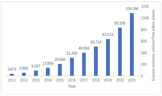 In recent years, to promote the high-quality development of green couriers, green transportation, green consumption, and other areas, the concept of saving has been deeply rooted in people’s hearts; green low-carbon mode of production and lifestyle is accelerating the formation. The report of the 20th National Congress of the Communist Party of China proposed to “accelerate the green transformation of the development mode”, and such measures are especially evident in the express delivery industry. The 2021 government work report clearly pointed out that we should strengthen the construction of urban and rural circulation systems, especially to speed up e-commerce and express into the countryside, and expand consumption at the county and township level, which is the eighth time “express” was included in the government work report. According to the National Bureau of Statistics data, China’s 2011–2021 express business volume increased significantly (see Figure 1). At the same time, along with the in-depth implementation of the new development pattern strategy, China’s express industry will certainly enter a new stage of development shortly, bringing a new round of growth in the volume of express business and its revenue [1,2,3,4].