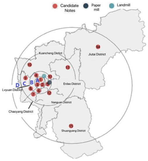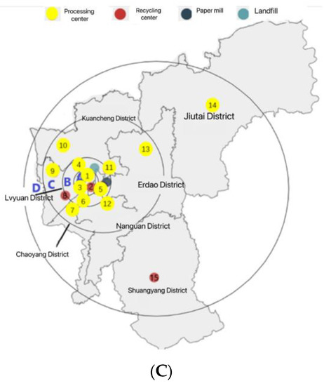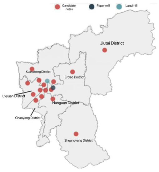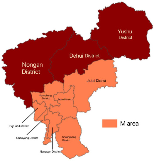 In this paper, according to the economic development and administrative division of Changchun, seven district administrative units under Changchun are selected as the area under study (hereinafter collectively referred to as M area), including Nanguan District, Kuancheng District, Chaoyang District, Erdao District, Lvyuan District, Shuangyang District, and Jiutai District (not considering Gongzhuling District). In this paper, we design the reverse logistics network for express packaging in region M. The regional map of region M is shown in Figure 2.