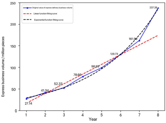To meet the design requirements of the subsequent recycling network, the data in Table 1 need to be used to forecast the express business volume of Changchun in the next few years and select the appropriate value as the design value. In this paper, the least squares method is used to fit a linear function and an exponential function to the express business volume data of Changchun from 2013 to 2020, and the obtained functional relationships are shown in Equations (1) and (2).