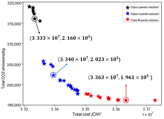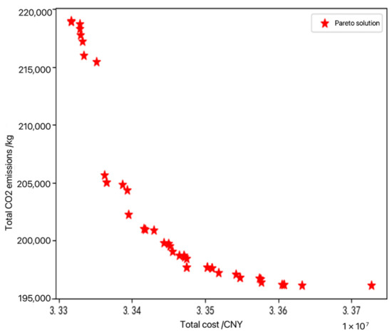 In terms of site selection, Harsaj proposed a fuzzy multi-objective optimization model that quantifies three aspects simultaneously: economic, environmental, and social, and solved it using an improved particle swarm algorithm (PSO), and finally validated the model with a medical syringe recycling system [18]. Gao proposed a reverse logistics network design scheme based on a forward logistics network, and constructed an optimization model based on a multi-objective scenario with the objective functions of maximizing the expected total monetary profit, minimizing the expected total carbon emission cost, and maximizing the expected total job creation, and transformed it into a single-objective model to finally obtain the Pareto-optimal solution, and finally validated the effectiveness by using tires as an example [19]. Nie studied the supply chain configuration problem, constructed a mixed integer linear programming model with minimizing carbon emissions as the objective function, solved it using dynamic programming algorithms, and finally carried out an example verification to achieve a balance between economic and social benefits [20]. Guo studied fresh food distribution, built a two-stage model, considered the total system cost and vehicle path, and solved using a genetic algorithm and particle swarm algorithm, which effectively reduced carbon emissions and total cost [21]. Reddy constructed a multi-level multi-period mixed integer linear programming model with profit maximization as the objective function, considering the effects of facility location, vehicle type, and return rate, and finally gave an example analysis [22].