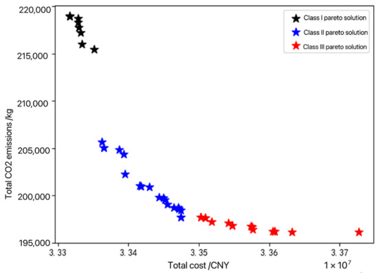 With the development of China’s express delivery industry, the number of express packaging has proliferated, leading to many problems such as environmental pollution and resource waste. In this paper, the process of reverse logistics network design for express packaging recycling is given as an example in the M region, and a four-level network containing primary recycling nodes, recycling centers, processing centers, and terminals is established. A candidate node selection model based on the K-means algorithm is constructed to cluster by distance from 535 courier outlets to select 15 candidate nodes of recycling centers and processing centers. A node selection model based on the NSGA-II algorithm is constructed to identify recycling centers and processing centers from 15 candidate nodes with minimizing total cost and carbon emission as the objective function, and a set of Pareto solution sets containing 43 solutions is obtained. According to the distribution of the solution set, the 43 solutions are classified into I, II, and III categories. The results indicate that the solutions corresponding to Class I and Class II solutions can be selected when the recycling system gives priority to cost, Class II and Class III solutions can be selected when the recycling system gives priority to environmental benefits, and Class III solutions can be selected when the society-wide recycling system has developed to a certain extent. In addition, this paper also randomly selects a sample solution from each of the three types of solution sets, conducts coding interpretation for site selection, vehicle selection, and treatment technology selection, and gives an example design scheme.