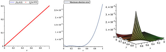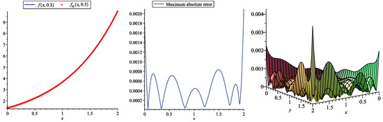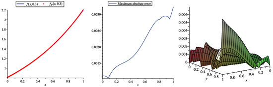Plots of the exact and approximate solutions (left), maximum absolute error (middle) at , and absolute error (right) obtained by the 2D-SJPs with and for Example 3.