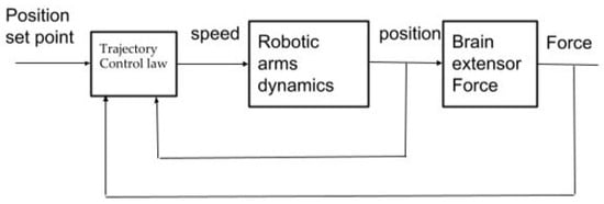 The authors propose the following control scheme (see Figure 3). The robotic arm speed is a proposed function (see Equation (23)) that depends on its position and force. These dependencies allow the control to be more adaptive to the patient’s brain tissue force. This control law has three arbitrary lambda coefficients which model the general behaviour of the robotic arm speed. These three coefficients must be correctly defined to achieve the correct speed shape. The relevant parameters and variables are shown in Table 1 and Table 2.