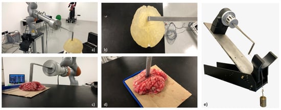 (a,b) robotised brain retraction in a 3D printed brain. (c,d) robotised brain retraction in a pig’s brain. (e) Sensorised brain retractor calibration.