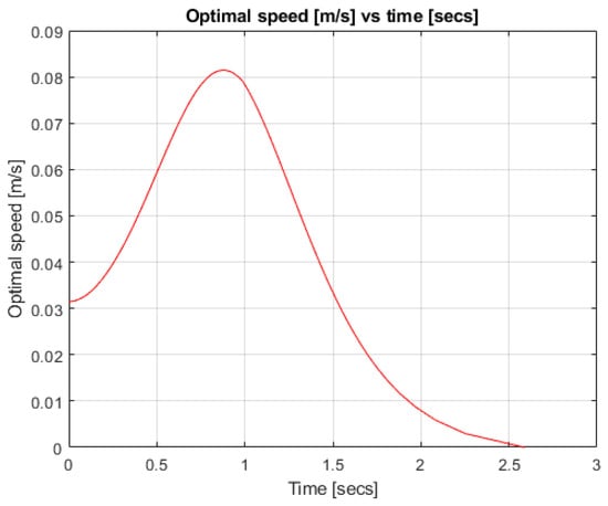Figure 5, Figure 6, Figure 7 and Figure 8 present the dynamic behaviour of our proposed method. In Figure 5, we show the robotic arm speed. There is a positive speed at position zero; movement starts, and the speed increases until a maximum value is reached. This maximum depends on the lambda parameters. In the current study, we set the lambda parameters in such a way as to achieve the minimum values for the cost functional. The speed at the final position is zero. It is important to note that the robotic arm speed is the output variable of the control scheme. This speed is the robotic arm speed set point input. We considered that the real speed and robotic arm speed were equal.